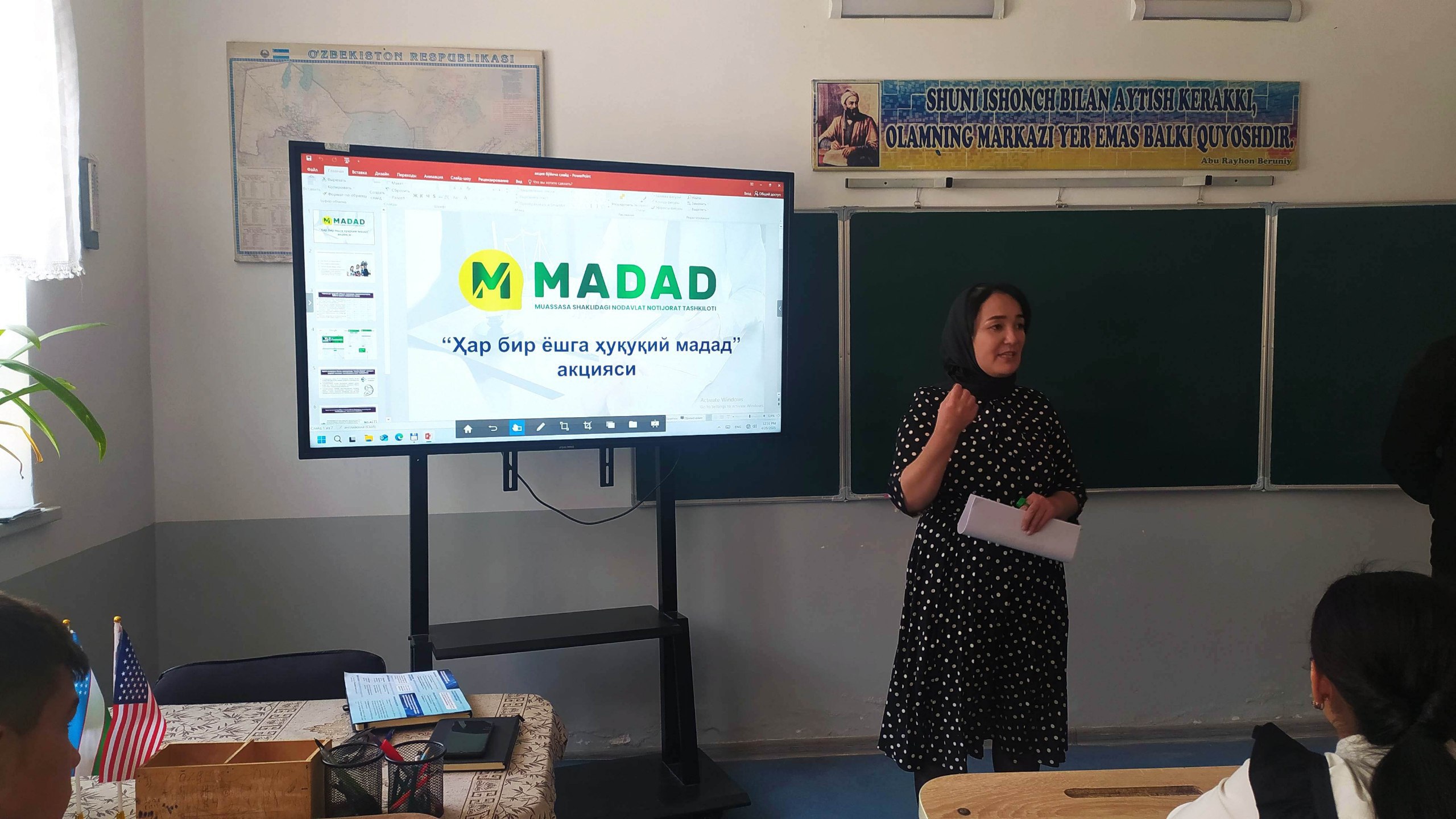 •      “Адолат йўлида Мадад билан”:  Ушбу тренингда ёшларга ҳуқуқлари бузилганда қандай ҳаракат қилиш,  қаерга мурожаат қилиш,  қайси ҳуқуқий механизмлардан фойдаланиш мумкинлиги бўйича маслаҳатлар берилди.