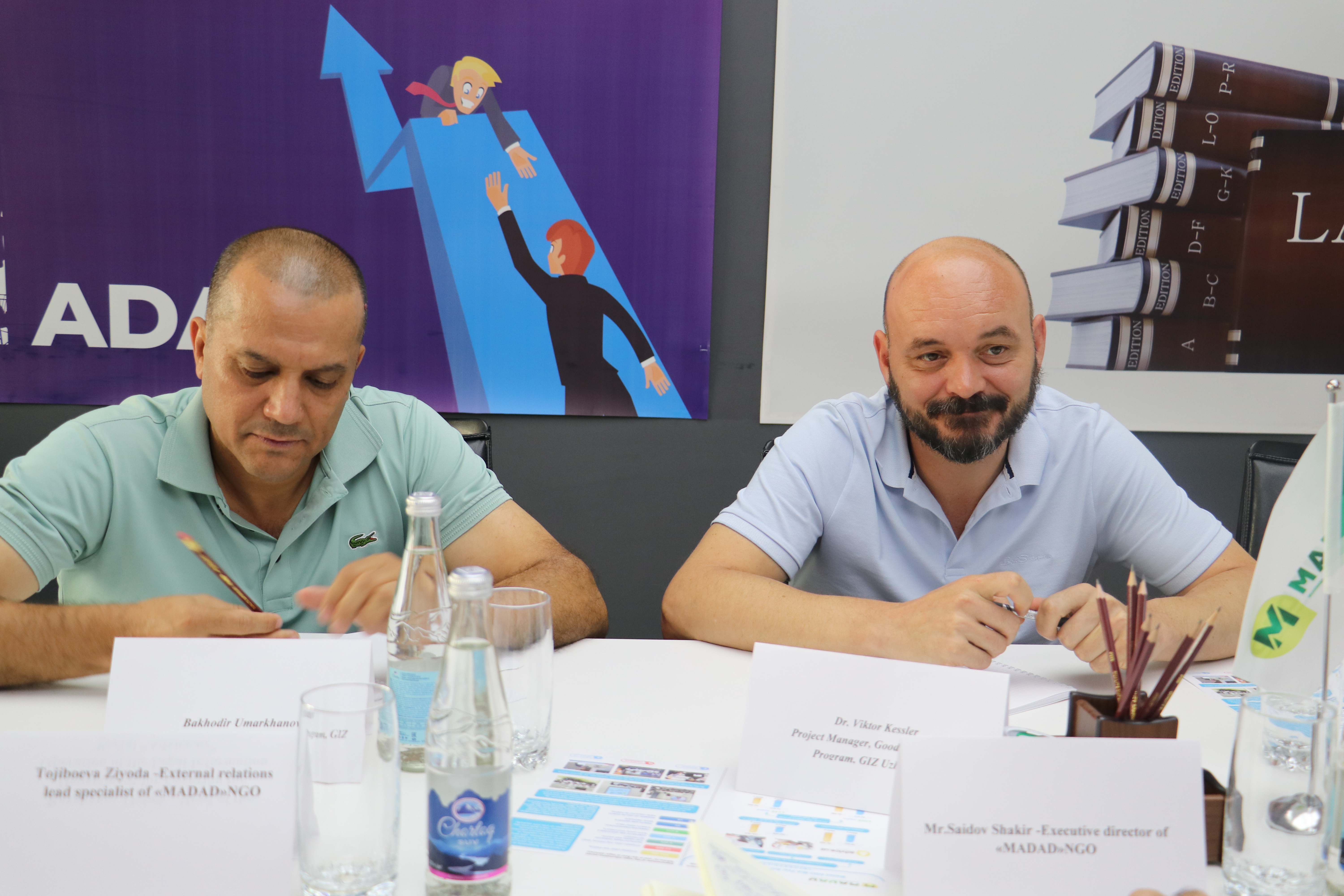 7 август куни – "Мадад" нодавлат нотижорат ташкилоти ижрочи директори Ш.Саидов Германия халқаро ҳамкорлик жамияти (GIZ) "Яхши бошқарув" дастури лойиҳа раҳбари Виктор Кесслер ҳамда маслаҳатчи Баҳодир Умархонов билан муҳим учрашув ўтказди.