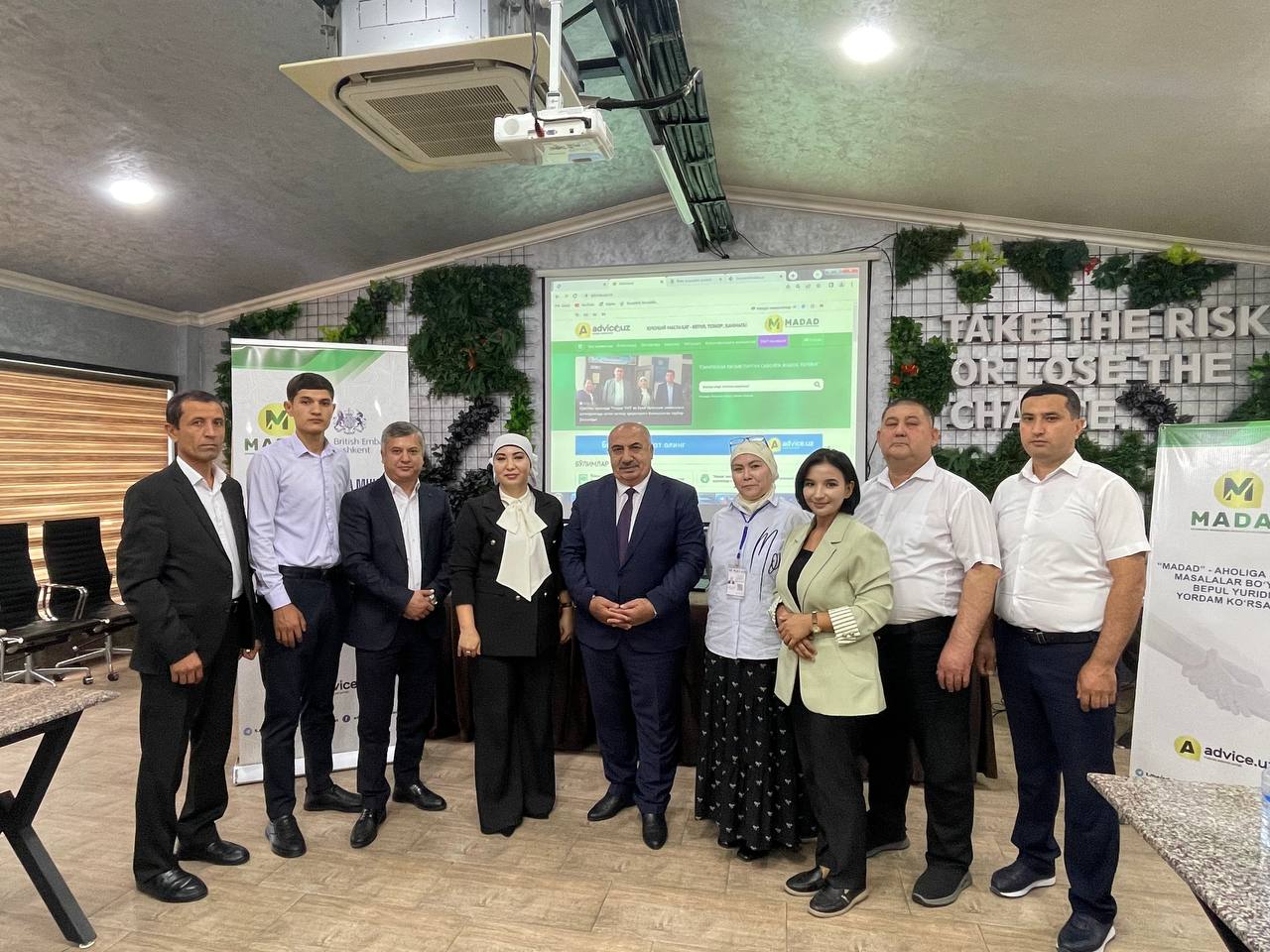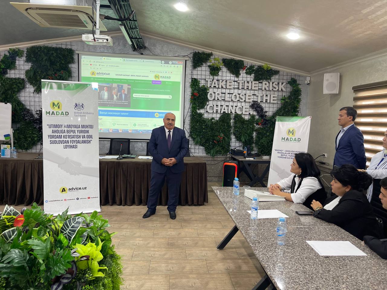 Бугун Андижон вилоятида "Мадад" нодавлат нотижорат ташкилоти ҳамда Буюк Британиянинг Ўзбекистондаги элчихонаси ҳамкорлигида амалга оширилаётган "Ижтимоий ҳимояга муҳтож аҳолига бепул юридик ёрдам кўрсатиш ва одил судловдан фойдаланиш" лойиҳаси доирасида маҳалла вакиллари учун навбатдаги тренинг бўлиб ўтди.