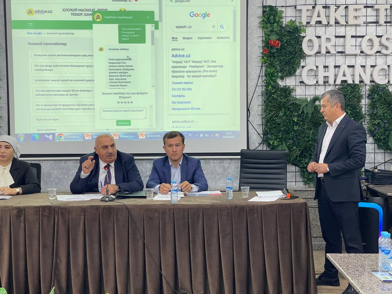 Йиғилишда Андижон вилояти адлия бошқармаси масъул ходими Э.Жулиев ҳам иштирок этиб, иштирокчиларнинг саволларига жавоб беришди. Тренинг якунида қатнашчиларга сертификатлар топширилди.