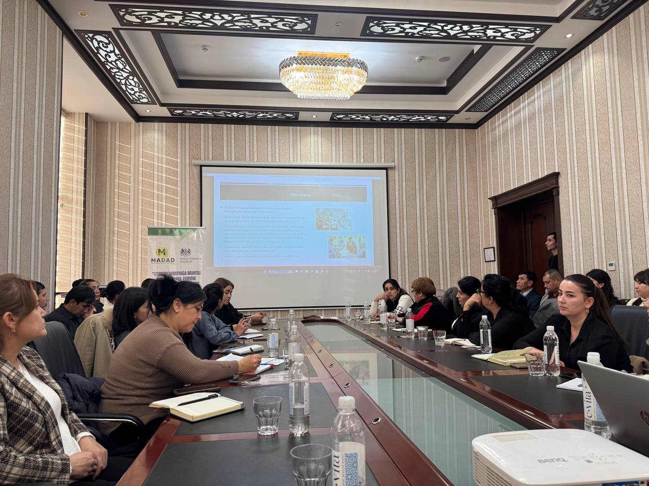 Иштирокчиларга "Мадад" ННТ ижрочи директори Ш. Саидов, ижрочи директор ўринбосари У. Ҳакимов, бўлим бошлиғи А. Эзозхонов ва Халқаро ҳамкорлик ва лойиҳаларни амалга ошириш офисининг раҳбари Р.Сарабекова томонидан “Ижтимоий ҳимояга муҳтож аҳолига бепул юридик ёрдам кўрсатиш ва одил судловдан фойдаланиш” лойиҳасининг мақсади, вазифалари ва аҳоли учун самарали жиҳатлари, шунингдек, “Мадад” ННТ фаолияти ва амалга оширилаётган лойиҳалари, ҳамда “Ногиронлиги бўлган шахслар ва хотин-қизларнинг ҳуқуқий ҳимояси” бўйича батафсил тушунтиришлар берилди.