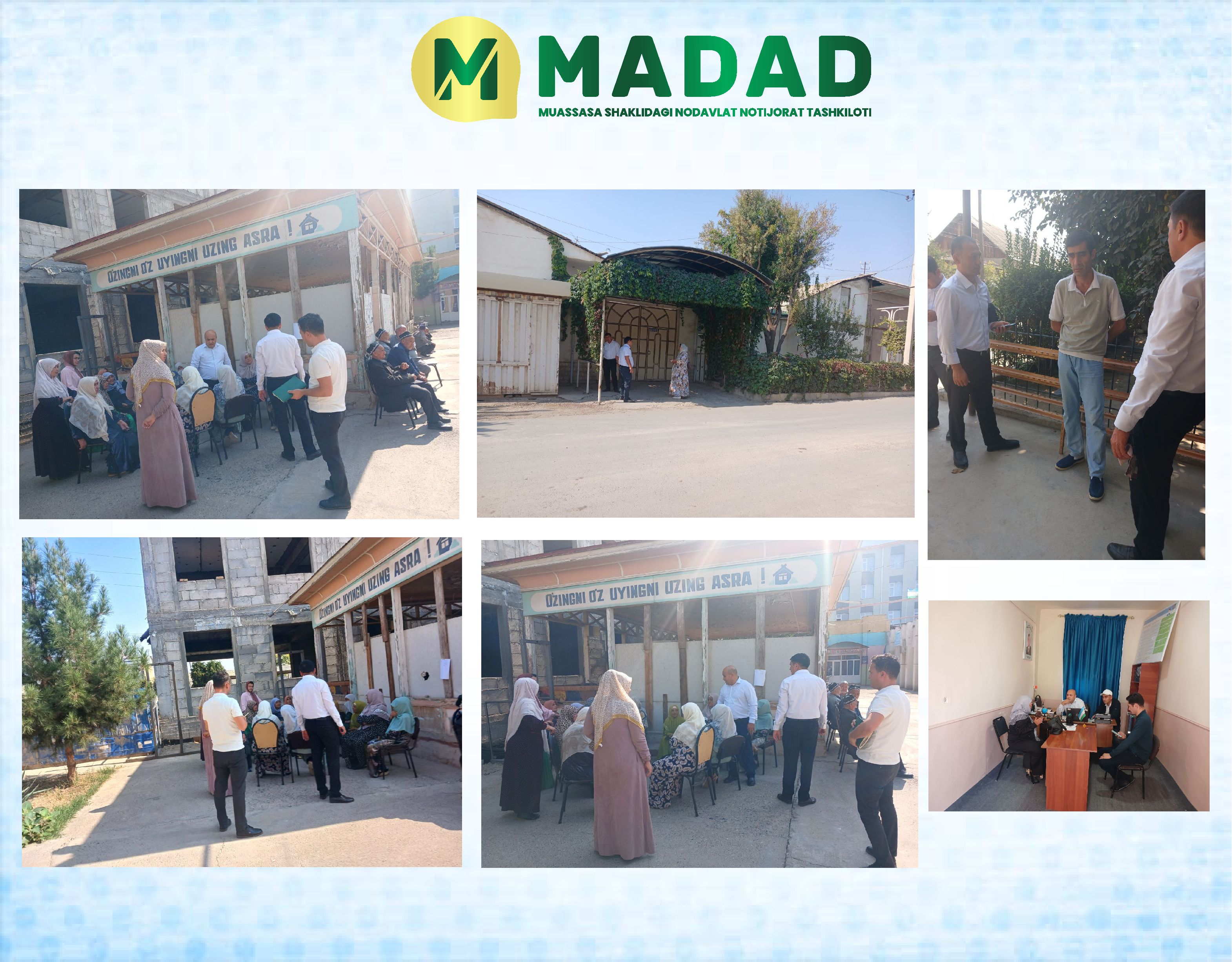 Жумладан, “Мадад” ННТ ходимлари “Адлия куни”, “Ҳуқуқий тарғибот куни” ҳамда сайёр қабулларда иштирок этиб, аҳолига, авваламбор, ижтимоий ҳимояга муҳтож шахсларга бепул бирламчи юридик ёрдам кўрсатмоқда, ҳуқуқий муаммоларни суд ва бошқа давлат органлари орқали ҳал этишда зарур бўладиган ариза, шикоят ва даъво аризалари каби ҳуқуқий ҳужжатларни тайёрлашда кўмаклашмоқда.
