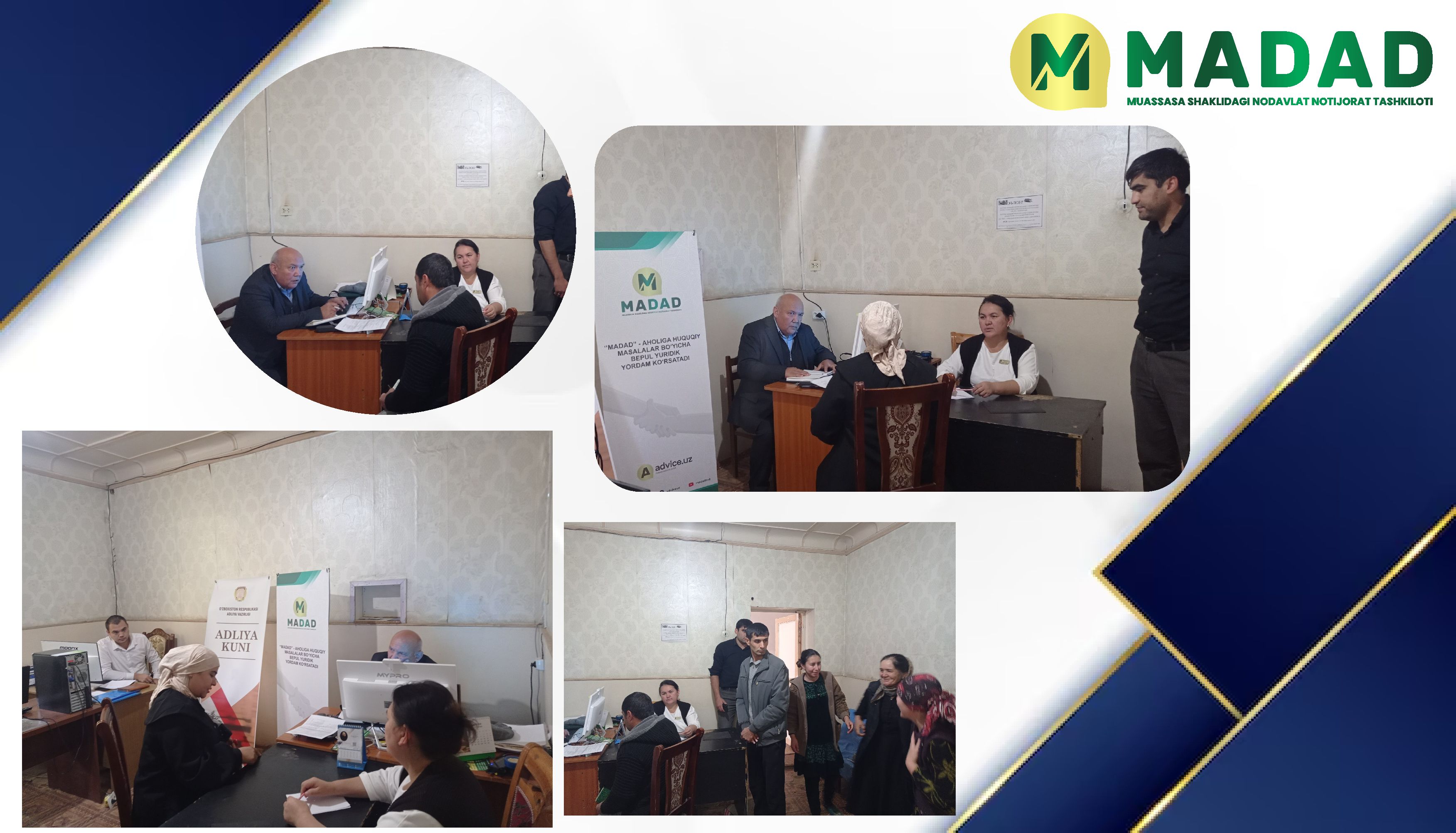 Жумладан, “Мадад” ННТ ходимлари “Адлия куни”, “Ҳуқуқий тарғибот куни” ҳамда сайёр қабулларда иштирок этиб, аҳолига, авваламбор, ижтимоий ҳимояга муҳтож шахсларга бепул бирламчи юридик ёрдам кўрсатмоқда, ҳуқуқий муаммоларни суд ва бошқа давлат органлари орқали ҳал этишда зарур бўладиган ариза, шикоят ва даъво аризалари каби ҳуқуқий ҳужжатларни тайёрлашда кўмаклашмоқда.