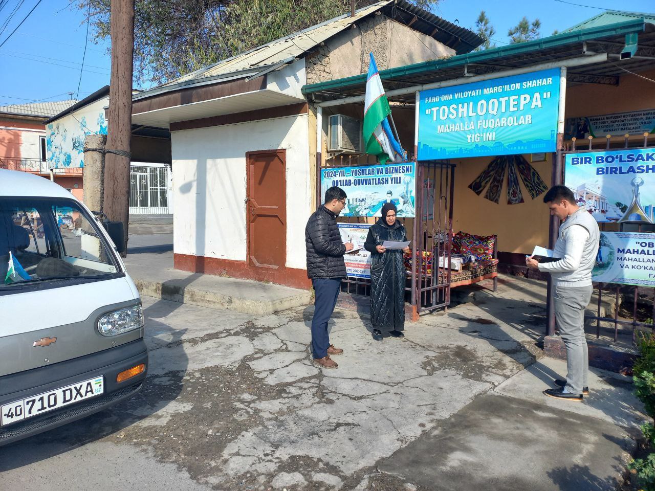 Фарғона вилояти Марғилон шахар​​​​ “Тошлоқтепа” МФЙ ҳудудида ташкил этилган навбатдаги тадбирда ҳудудий адлия органлари билан биргаликда “Мадад” ННТ шахар бюроси ходими ҳам уйма-уй юрган ҳолда аҳолининг ҳуқуқий муаммоларини ўрганди.