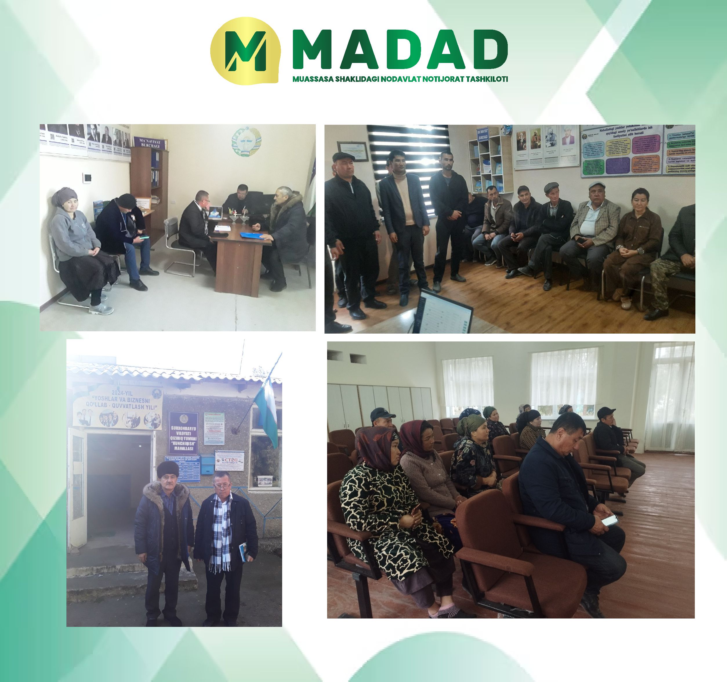 Жумладан, “Мадад” ННТ ходимлари “Адлия куни”, “Ҳуқуқий тарғибот куни” ҳамда сайёр қабулларда иштирок этиб, аҳолига, авваламбор, ижтимоий ҳимояга муҳтож шахсларга бепул бирламчи юридик ёрдам кўрсатмоқда, ҳуқуқий муаммоларни суд ва бошқа давлат органлари орқали ҳал этишда зарур бўладиган ариза, шикоят ва даъво аризалари каби ҳуқуқий ҳужжатларни тайёрлашда кўмаклашмоқда.