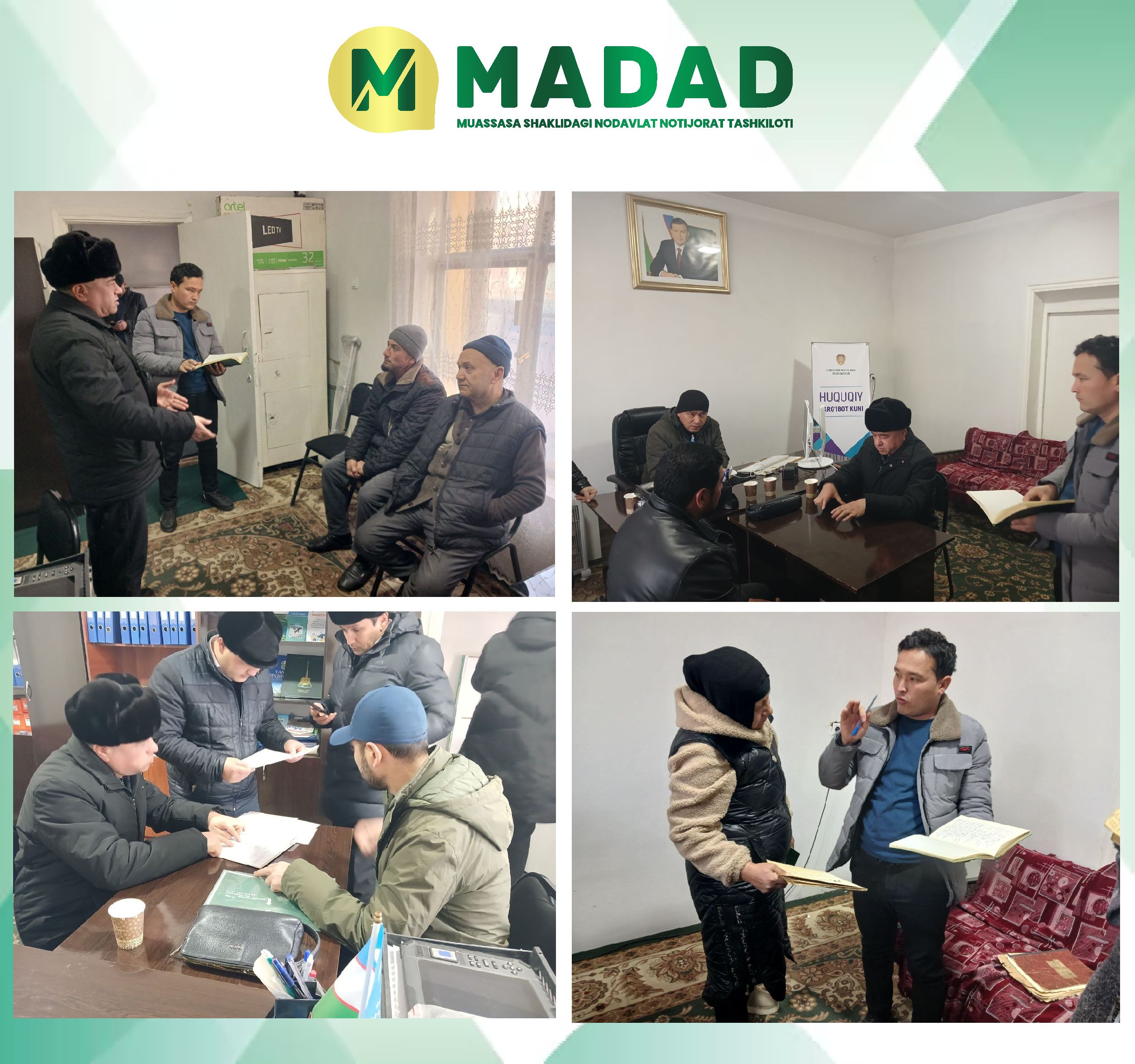 Жумладан, “Мадад” ННТ ходимлари “Адлия куни”, “Ҳуқуқий тарғибот куни” ҳамда сайёр қабулларда иштирок этиб, аҳолига, авваламбор, ижтимоий ҳимояга муҳтож шахсларга бепул бирламчи юридик ёрдам кўрсатмоқда, ҳуқуқий муаммоларни суд ва бошқа давлат органлари орқали ҳал этишда зарур бўладиган ариза, шикоят ва даъво аризалари каби ҳуқуқий ҳужжатларни тайёрлашда кўмаклашмоқда.