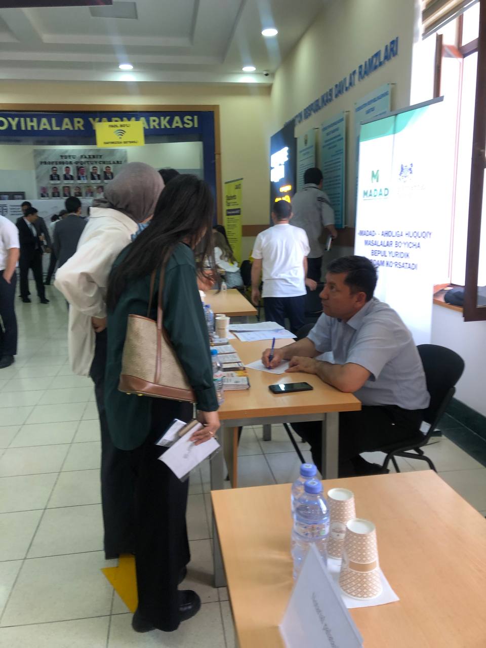 Жорий йилнинг 25 апрель куни Тошкент давлат юридик университети биносида талабалар ва ўқишни тамомлаётган ёш мутахассислар билан мавжуд бўш иш ўринлари тўғрисида маълумотлар бериш ҳамда талабаларнинг бандлигини таъминлаш мақсадида ташкил этилган “Карьера куни” меҳнат ярмаркаси “Мадад” ННТнинг масъул ҳодимлари ҳам иштирок этишди.