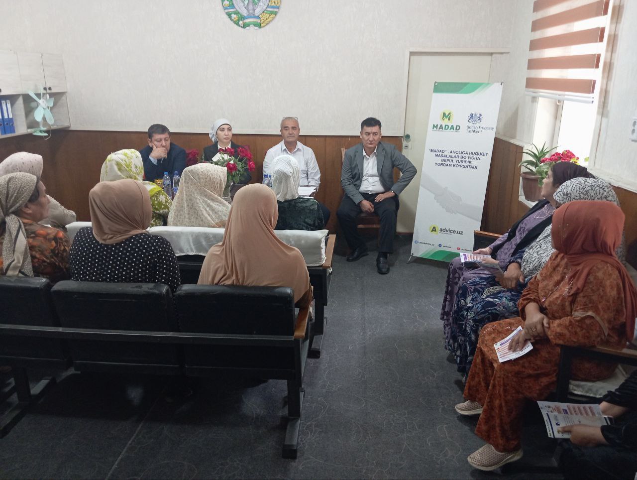 Бугун Фарғона вилояти Қўштепа туманида "Мадад" нодавлат нотижорат ташкилоти ҳамда Буюк Британиянинг Ўзбекистондаги элчихонаси ҳамкорлигида амалга оширилаётган "Ижтимоий ҳимояга муҳтож аҳолига бепул юридик ёрдам кўрсатиш ва адолатли судловдан фойдаланиш" лойиҳаси доирасида "Шодлик" ва "Шомирза" маҳаллаларида хотин-қизларнинг ҳуқуқлари, уларнинг ҳуқуқий ҳимояси ва бошқа масалаларга оид тарғибот тадбири ўтказилди.