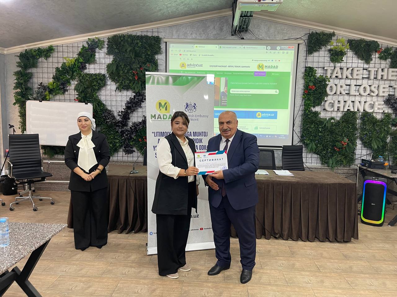 Бугун Андижон вилоятида "Мадад" нодавлат нотижорат ташкилоти ҳамда Буюк Британиянинг Ўзбекистондаги элчихонаси ҳамкорлигида амалга оширилаётган "Ижтимоий ҳимояга муҳтож аҳолига бепул юридик ёрдам кўрсатиш ва одил судловдан фойдаланиш" лойиҳаси доирасида маҳалла вакиллари учун навбатдаги тренинг бўлиб ўтди.