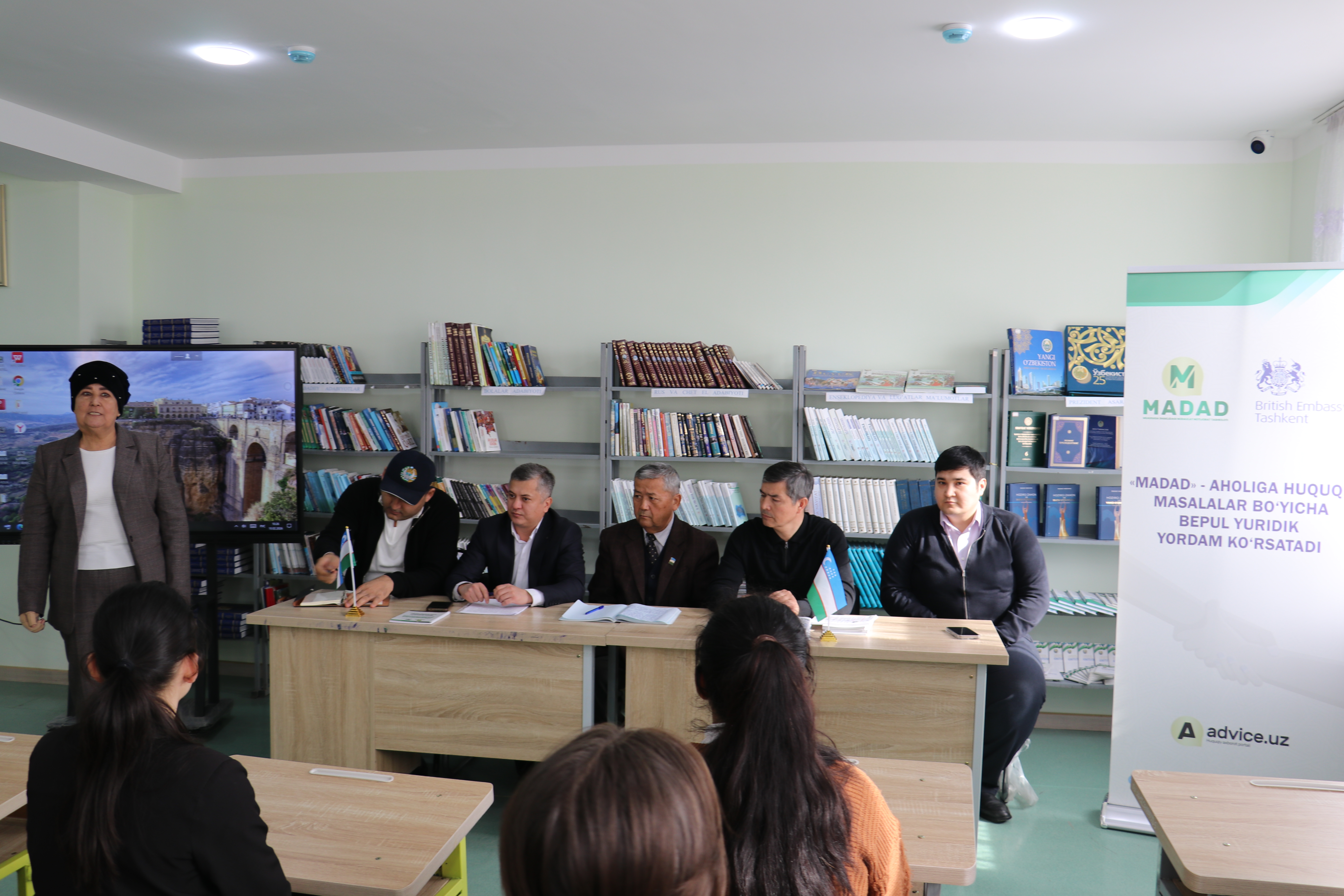 Очиқ мулоқот шаклида ташкил этилган мазкур тадбирда мактаб ўқувчилари ҳамда педагог ходимлар иштирок этдилар. Тадбир давомида “Мадад” ННТнинг масъул ходимлари томонидан ёшлар ўртасида жиноятчилик ва ҳуқуқбузарликларнинг олдини олиш, ҳуқуқий онг ҳамда ҳуқуқий маданиятни юксалтириш масалалари бўйича батафсил тушунтиришлар берилди.