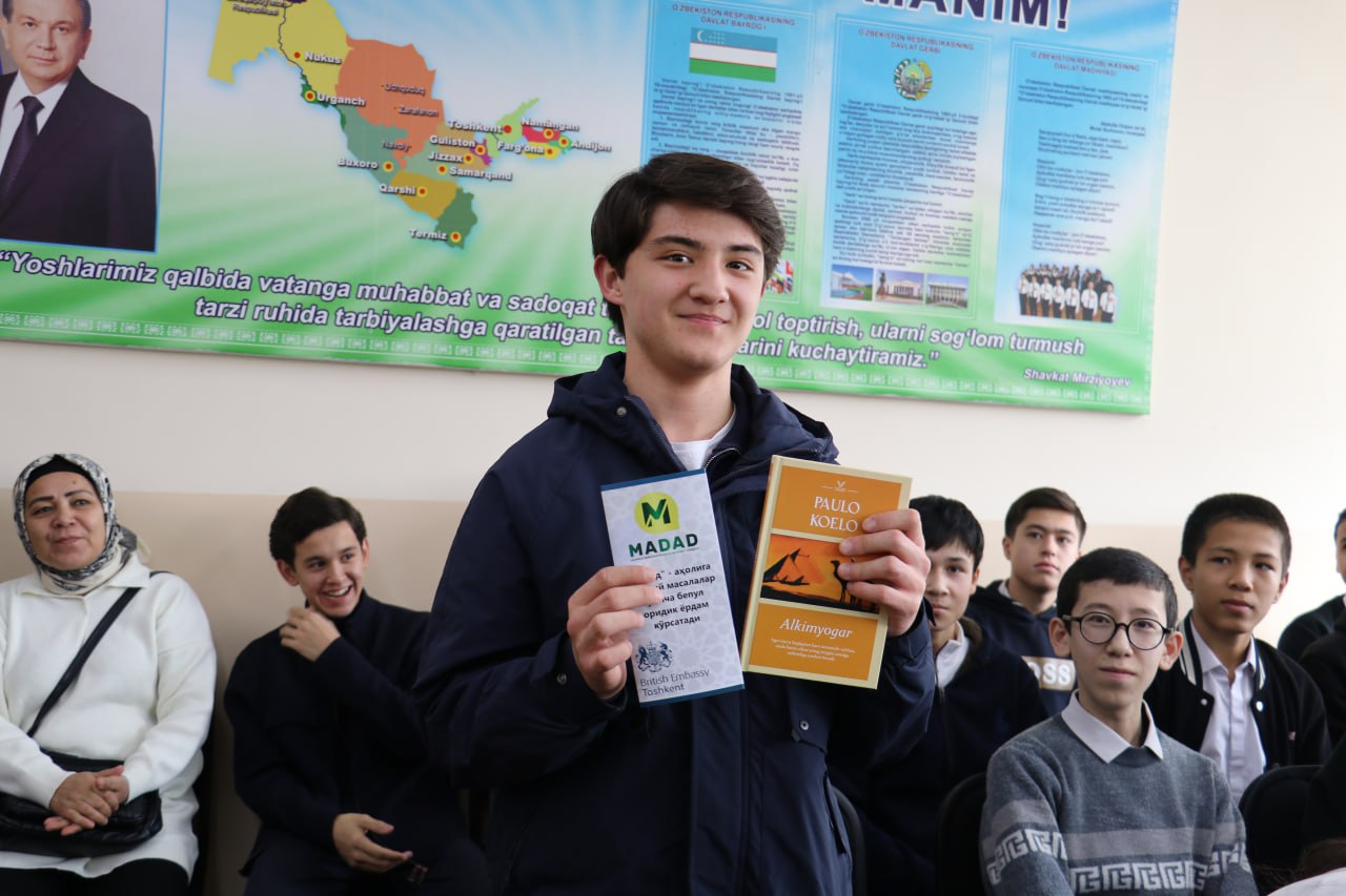 Тадбир якунида фаол иштирок этган ўқувчилар “Мадад” ННТ томонидан тайёрланган ҳуқуқий тарғибот материаллари — ваучер-флайерлар ҳамда эсдалик совғалари билан тақдирландилар.